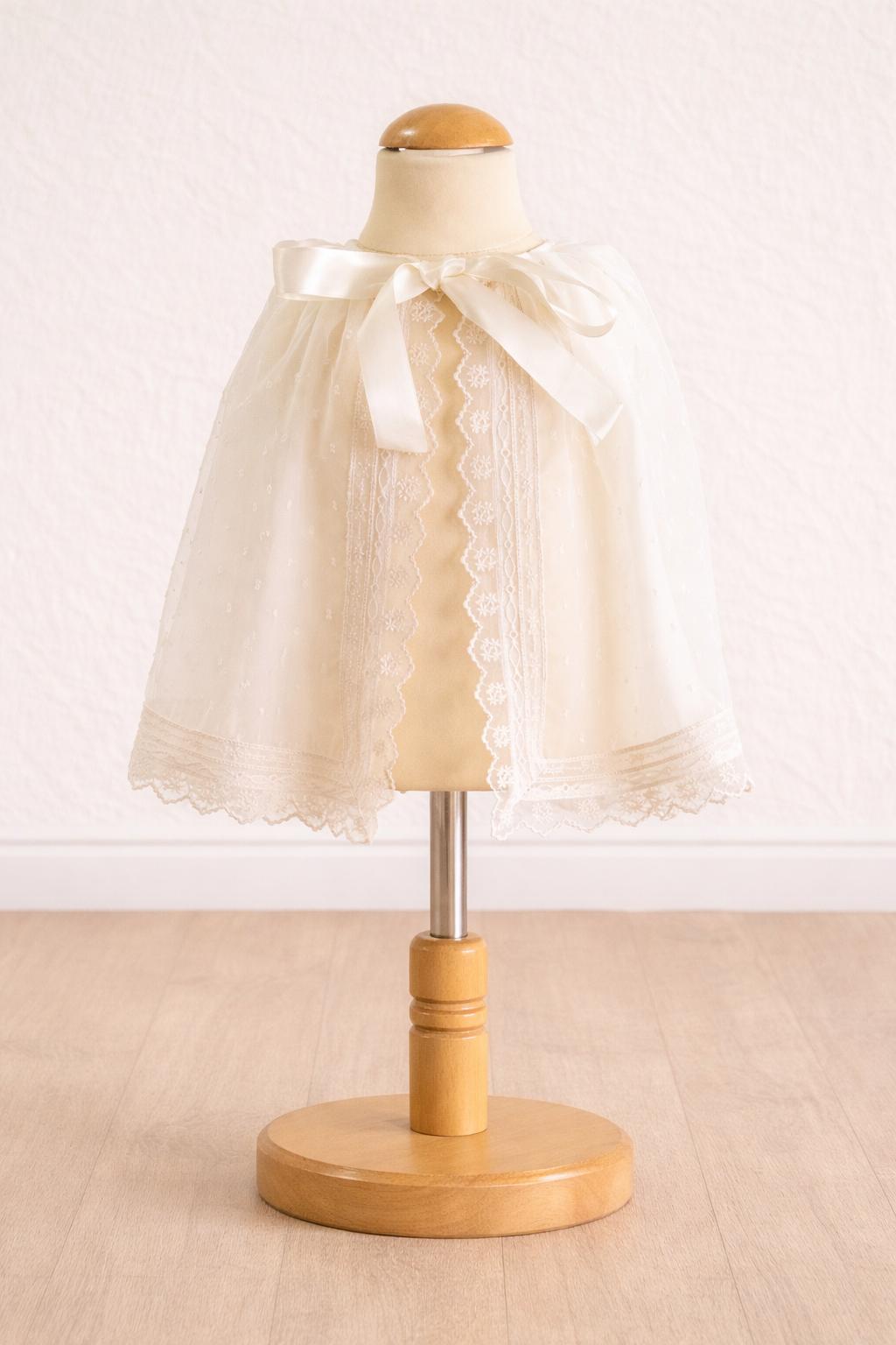 El tejido en plumeti cristal beige aporta una textura ligera, suave y sofisticada, ideal para bautizos tradicionales con un estilo clásico y atemporal. Su diseño extra largo proporciona una caída elegante y vaporosa, con posibilidad de adaptarlo en versión faldón largo o faldón corto según las necesidades de cada familia.