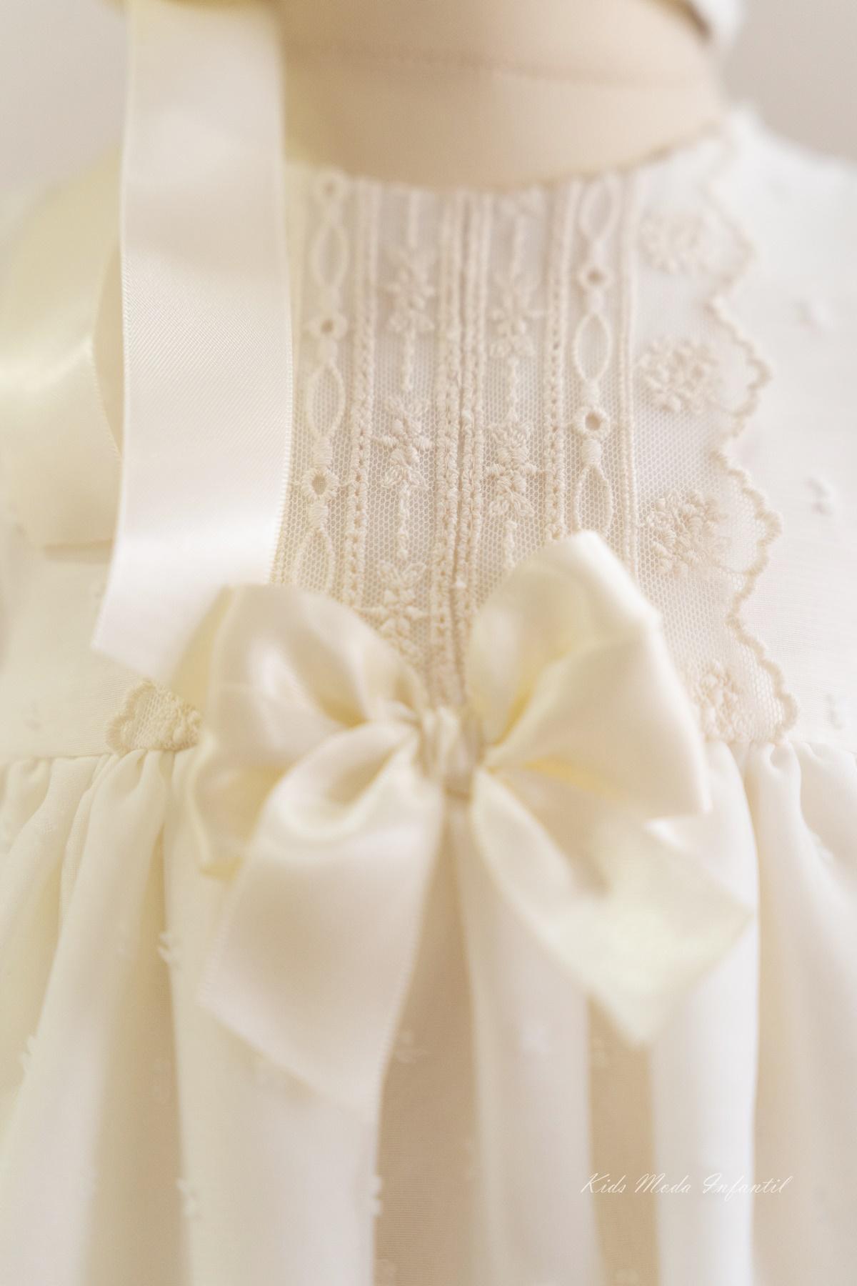 Faldón de bautizo para bebé en plumeti cristal beige con lazo beige manga corta – Familia 7 | Eva Martínez Artesanía | Kids Moda Infantil