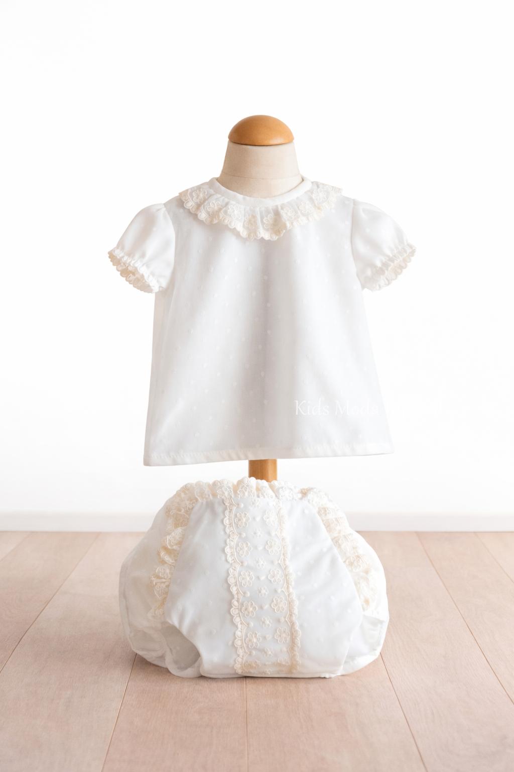 El conjunto está compuesto por camisa y cubre pañal. La camisa presenta un delicado cuello con volante y tul bordado, a juego con el cubre pañal, que incorpora puntillas y detalles decorativos. La espalda dispone de cierre con botones, facilitando su colocación.