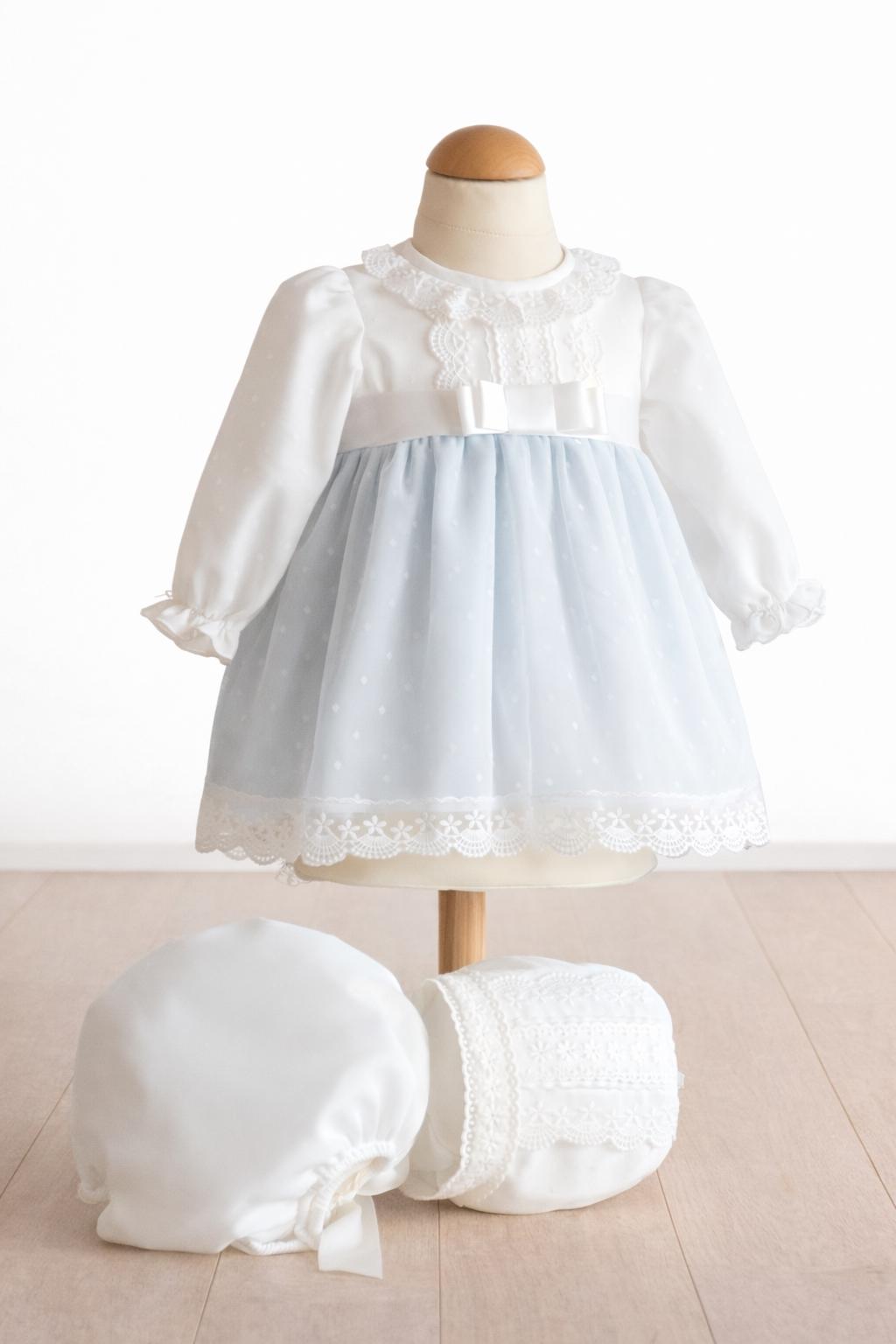 Delicado jesusito de bautizo para bebé en tul blanco combinado con azul celeste, una prenda de ceremonia infantil que destaca por su elegancia clásica y su acabado artesanal.