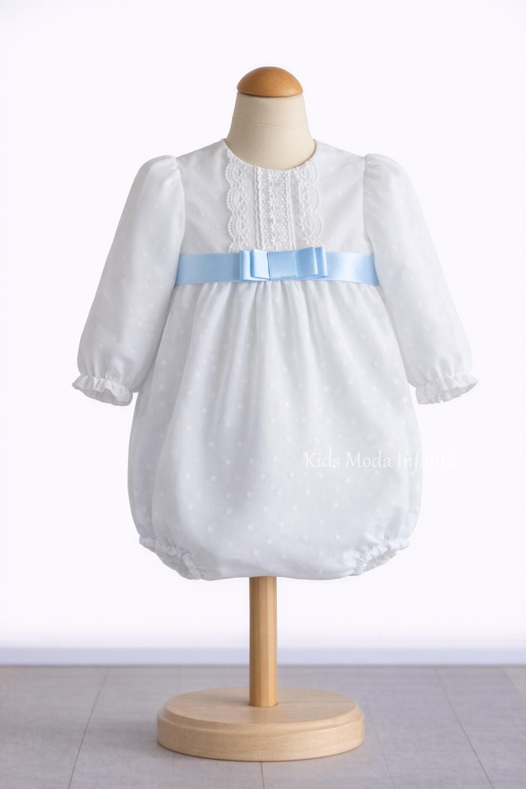 Pelele de Bautizo en Tul Blanco con Detalle Azul – Manga Larga