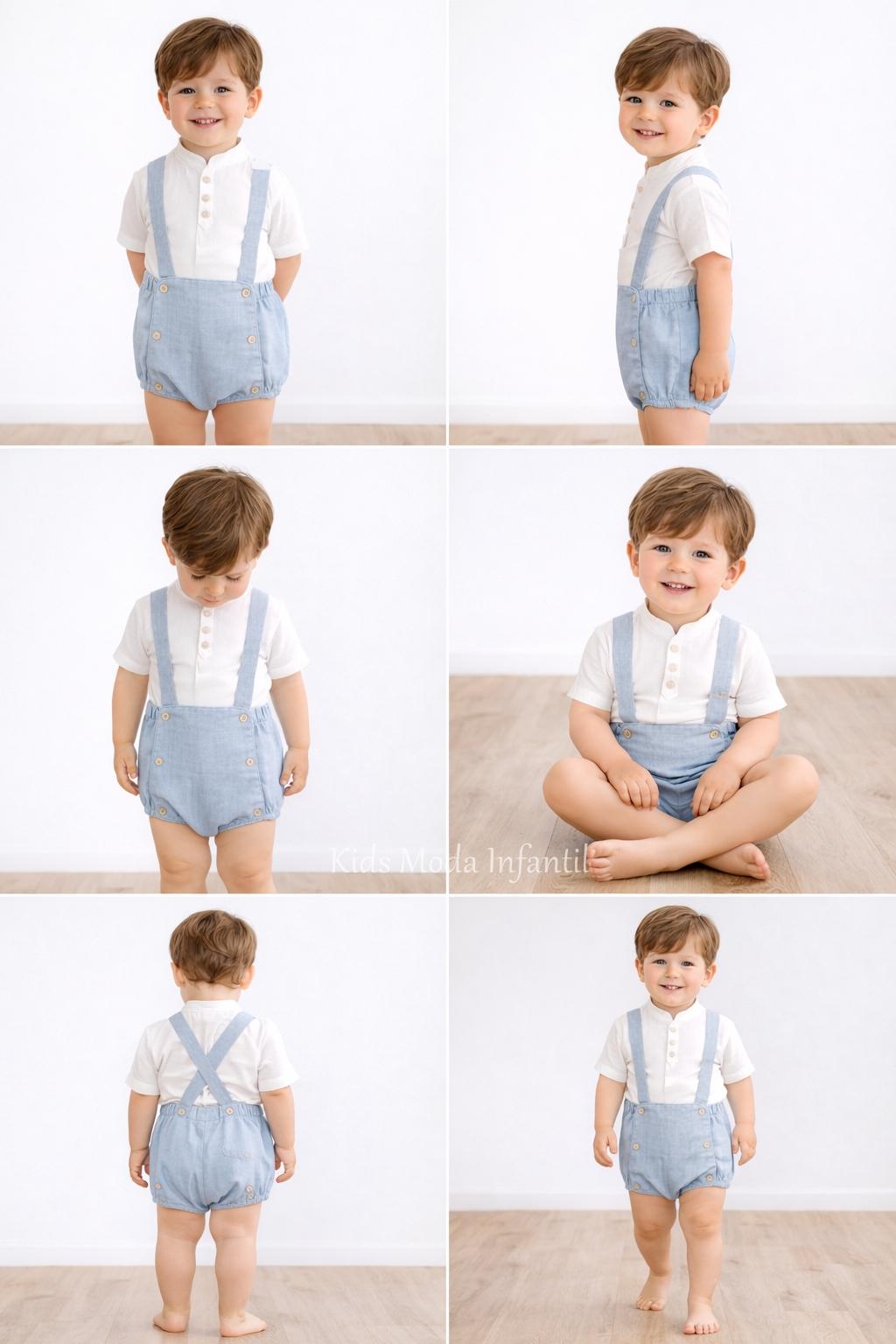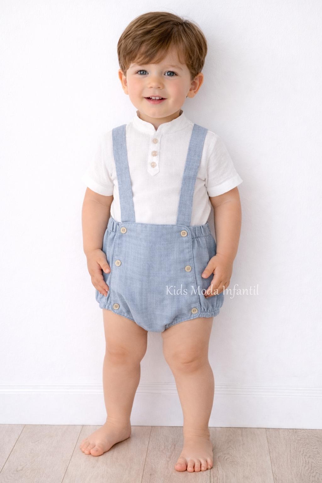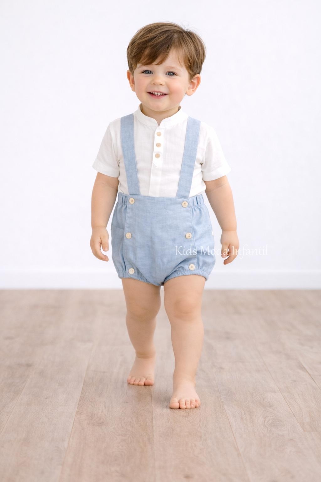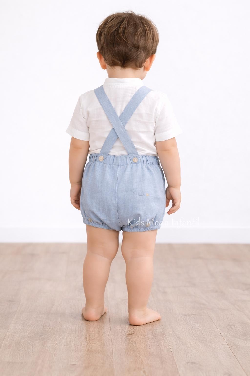 Este encantador conjunto infantil destaca por su estilo clásico inspirado en la tradición de la moda infantil española, combinando una camisa blanca de tejido ligero con botones nacarados y un peto bombacho con tirantes cruzados en la espalda, que aporta un ajuste cómodo y un toque elegante.