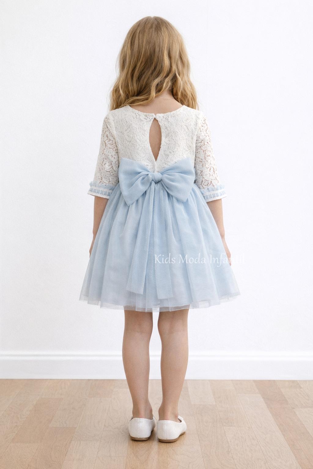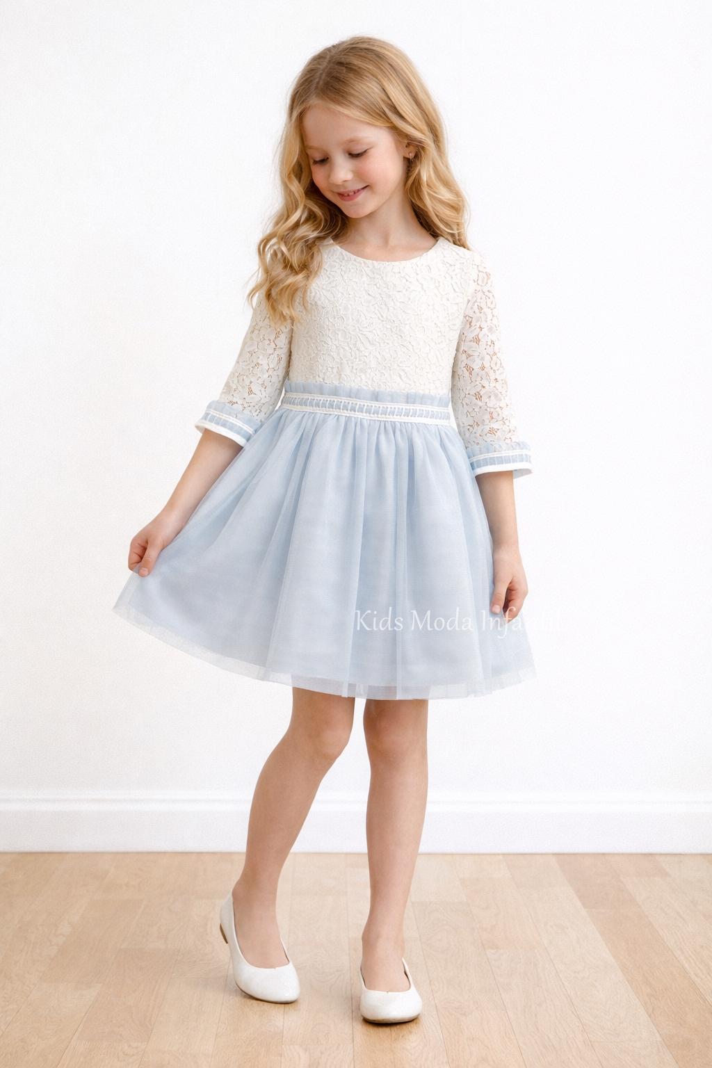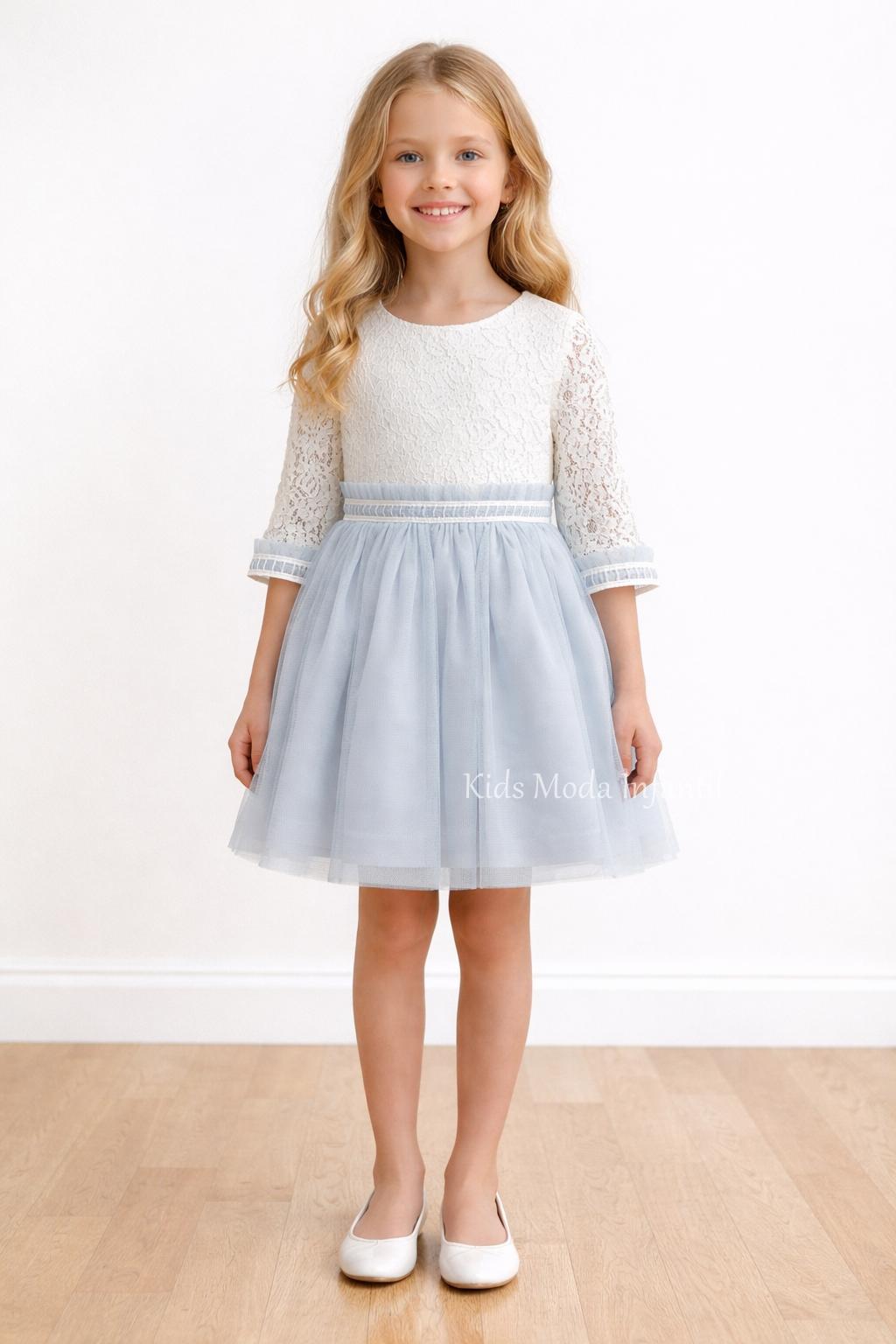 Vestido niña ceremonia encaje y tul azul empolvado manga francesa Basmarti